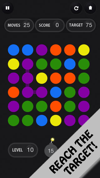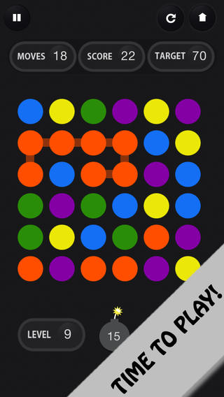 As the game progresses, you’ll find it gets harder to reach that dot goal. There is a bomb power-up that you can use to clear away a single dot, making it easier to link longer chains. There are only 15 bombs, however, so you’ll need to be parsimonious with each bomb and choose the right time to deploy it. More bombs can be purchased for $1.99 via IAP. Another IAP lets you get rid of the ads, which is nice.